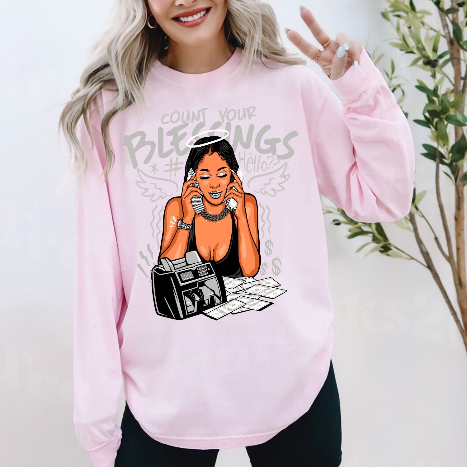 long-sleeve shirt with the tag Count Your Blessings blends calm reflections with a street smart style. Crafted from buttery soft breathable heavyweight cotton, its made for everyday wear with intention. Count Your Blessings in elegant script across the chest.