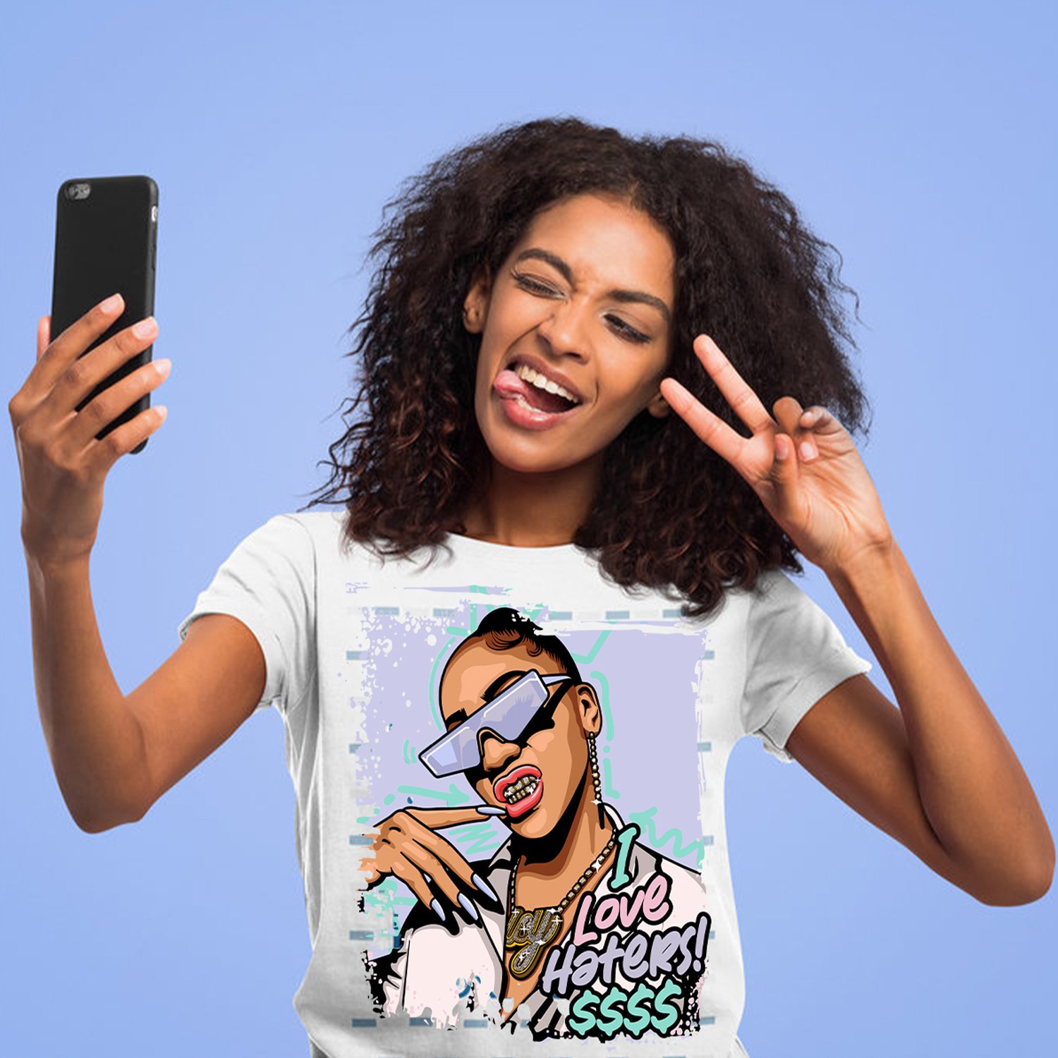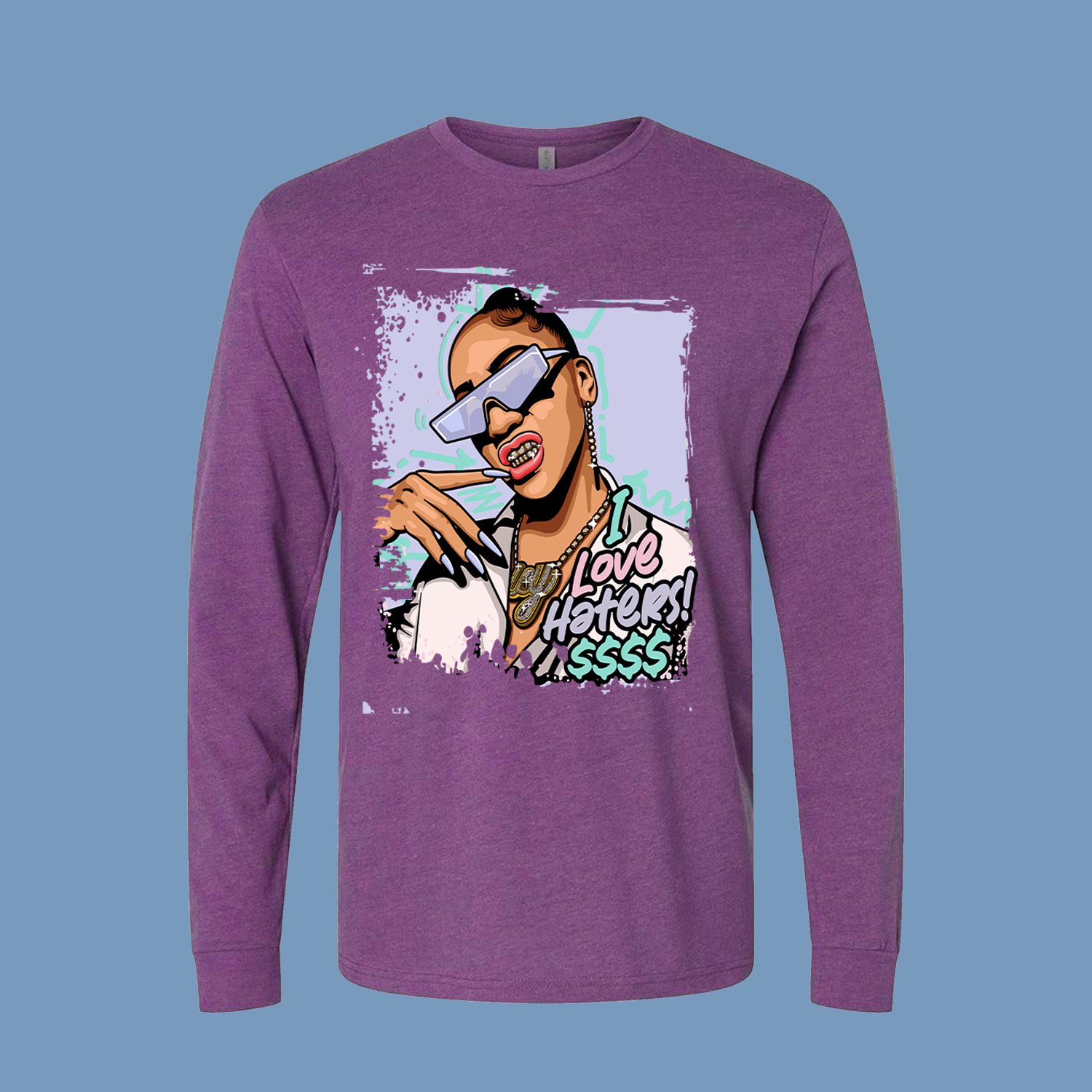 long-sleeve shirt (Red) with a fearless street wear piece that turns negativity in to power.Across the chest is a bold female in dark glasses with the wording i love haters in high contrast lettering combining a classic symbol of gritty style text, The dollar sign trail of like a flex, implying success in spite of the hate.